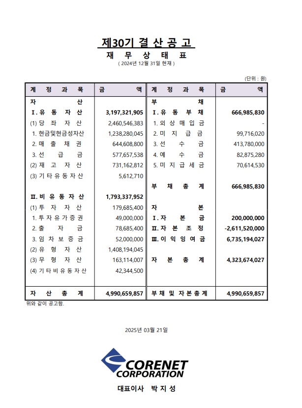 제30기 결산공고(2024년) 페이지 정보 작성자 최고관리자 댓글 0건 조회 378회 작성일 25-03-24 12:35 목록 본문 다음글제29기 결산공고(2023년) 24.03.29 목록